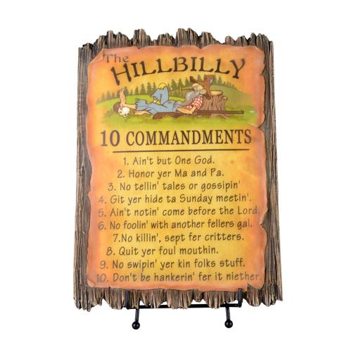 Straight from the hills of Kentucky, we present The Hillbilly Collection. This item features the 10 Hillbilly Commandments laminated onto a piece of poly resin "tree bark". The commandments come with an easel and measures 12" high
