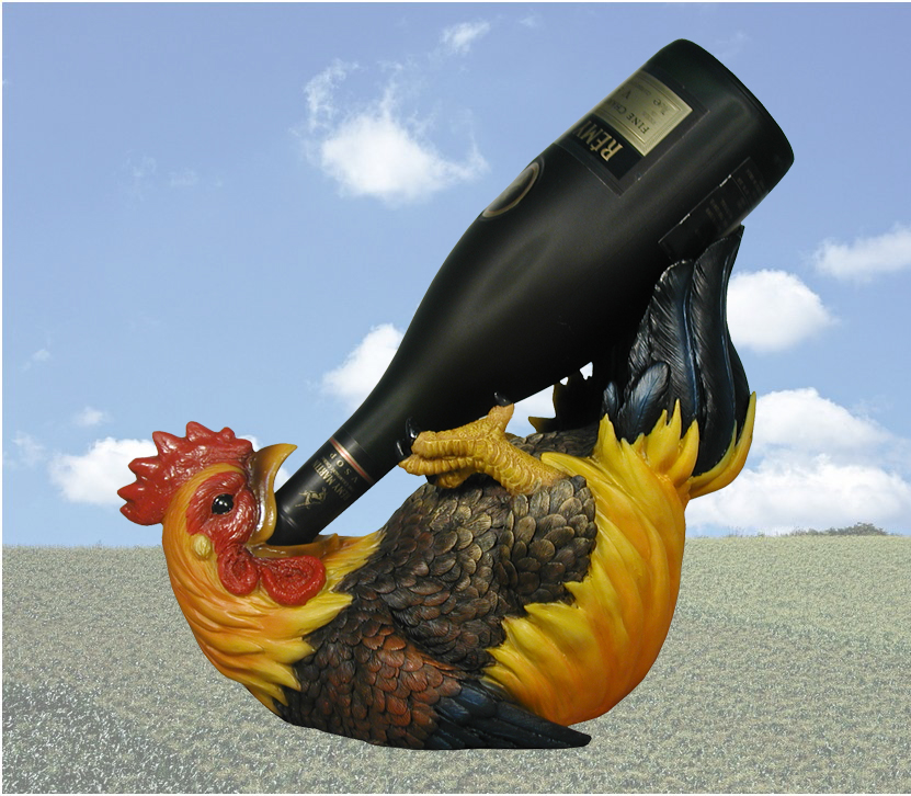 Rooster wine bottle holder. Made of strong cold cast polyresin. 10.5" long and 8.5" tall. Holds all standard wine bottles, similar style liquor bottles, or olive oil bottles. Product comes in color gift box. Wine not included!